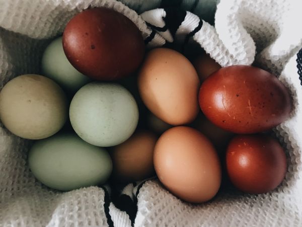 Straight from our free-ranging flock comes a surplus of small chickens with a variety of colors and temperaments. Most are "Easter-eggers," laying nearly one medium-sized colored egg every day during warmer months.